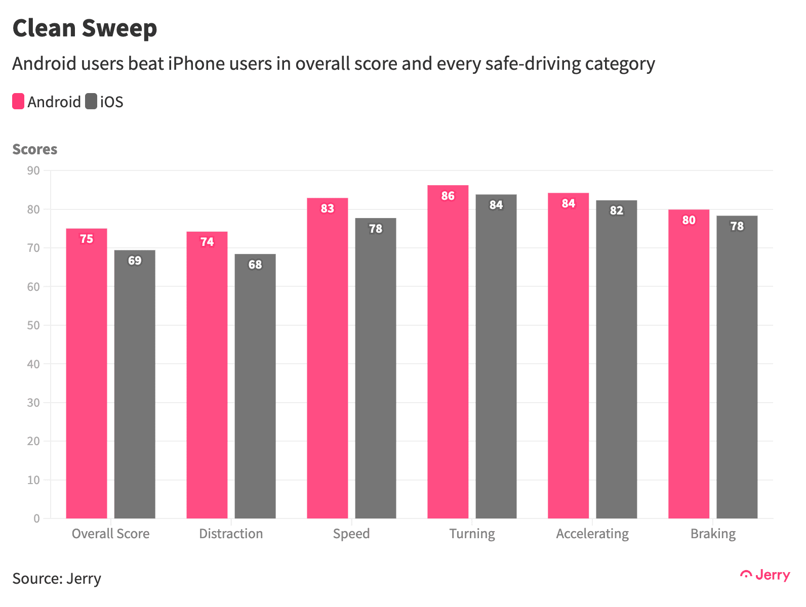 Now, why is there a clear difference between iPhone and Android users in regard to their driving behaviour? One of the reasons that Jerry suggests is that iPhone users tend to be younger and younger drivers are more inclined to drive recklessly. However, even younger Android users outscored their same-age iPhone counterparts and that is consistent across all age groups.