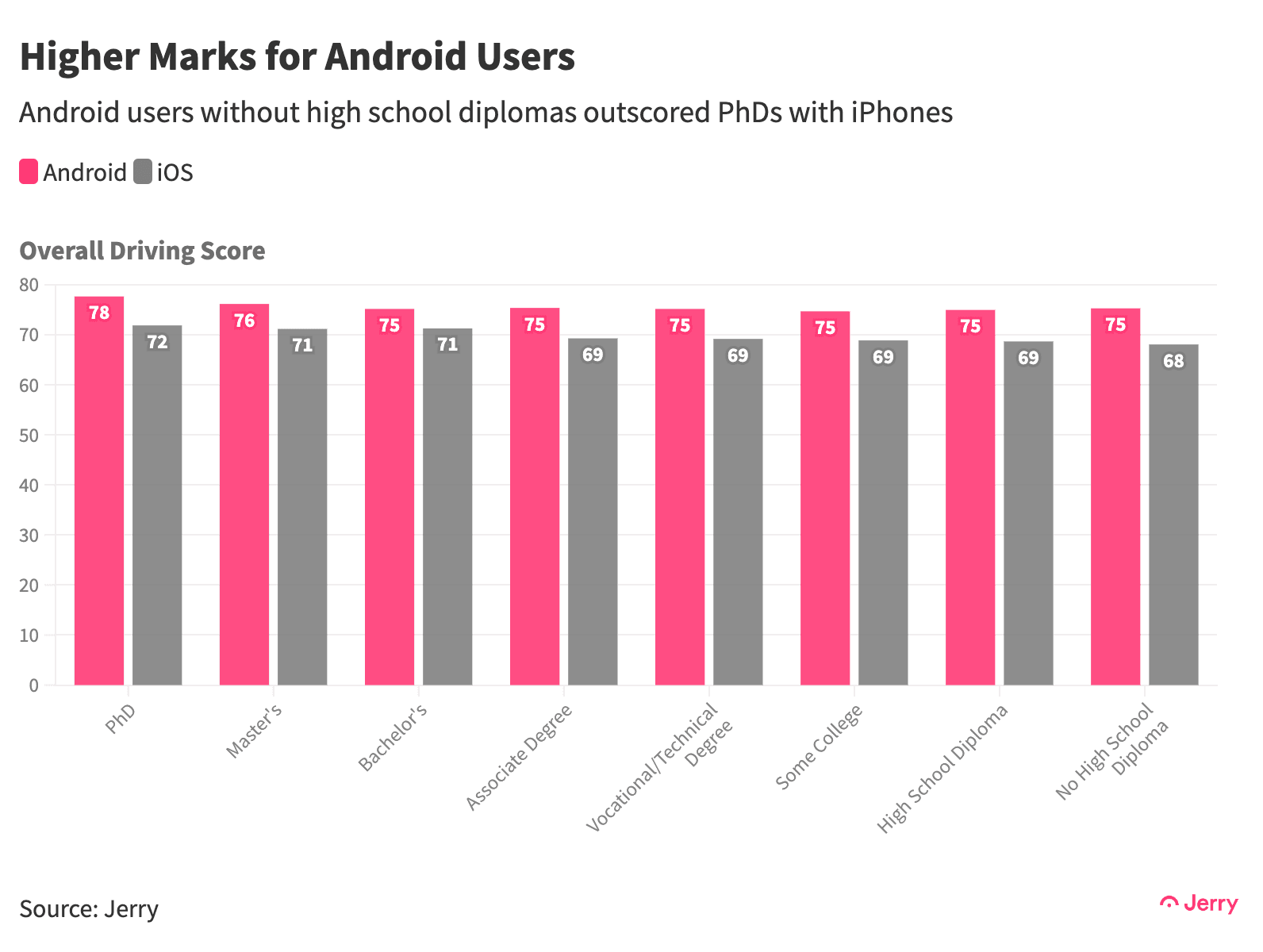 When you delve into the level of education, even Android users without a high school diploma scored higher than iPhone owners with bachelor’s or master’s degrees…and even PhD holders. This goes to show that being educated doesn’t make you more civilized (on the road).