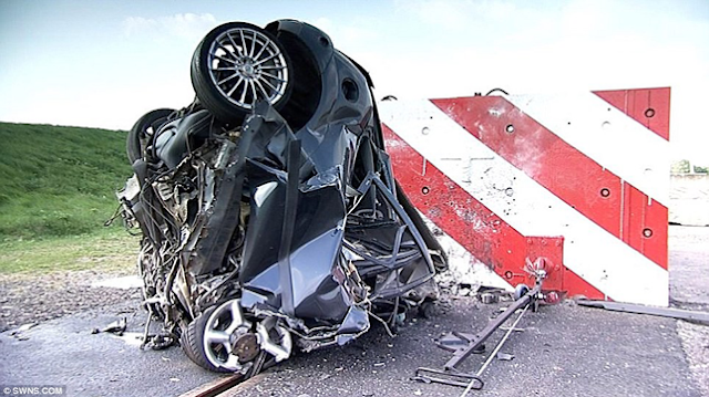 To give you an idea of what happens to an average family car if it crashes at 120mph, it would look like this: