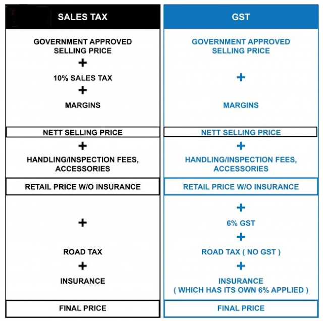 Previous sales tax (left) on a car versus the current goods and services tax (GST, right). Credit – www.paultan.org