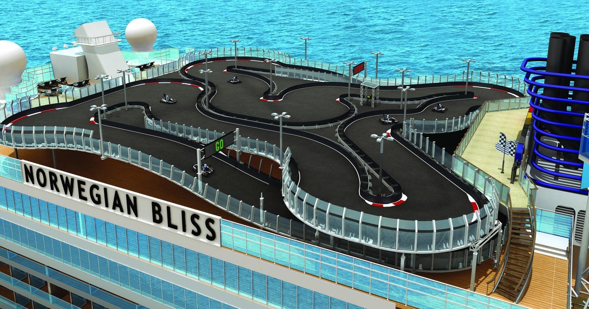 The first seafaring go-kart track was also on a Norwegian Cruises ship, a Ferrari-themed racetrack aboard the Joy. But the track on Bliss is 40% longer and, therefore, better!