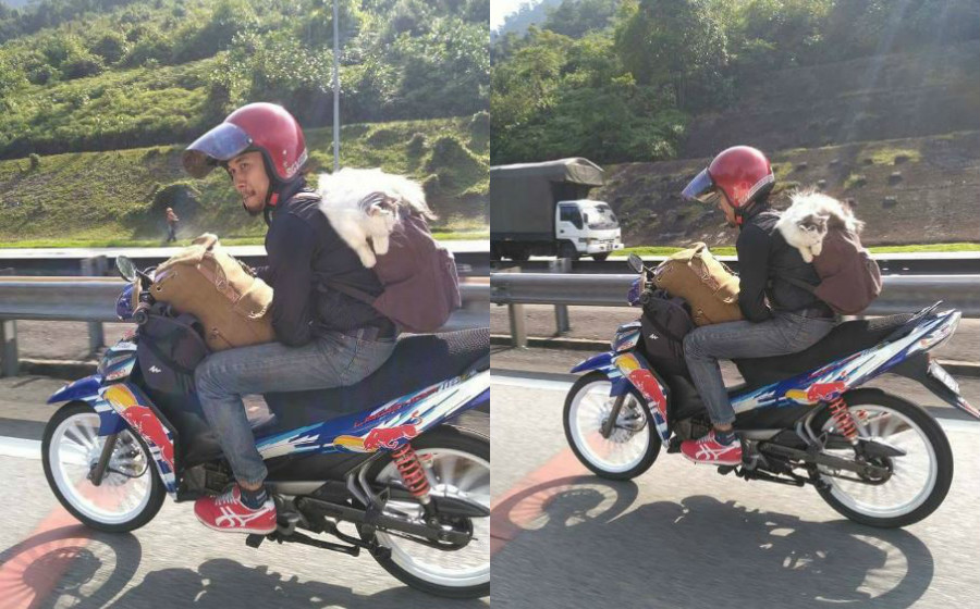 Seorang lelaki turut membawa pulang kucing kesayangan membonceng motosikal untuk pulang ke kampung halaman demi menyambut Hari Raya.