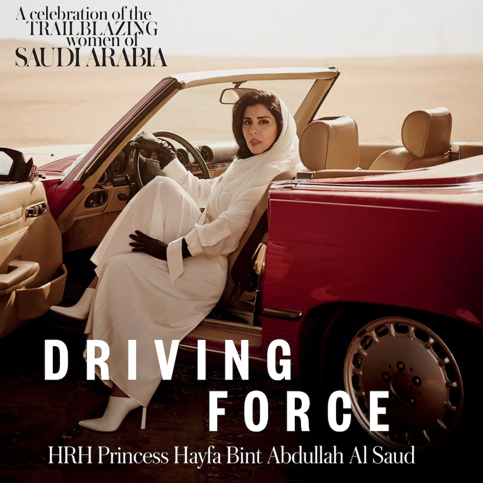 For the month of June, Vogue Arabia puts HRH Princess Hayfa bint Abdullah Al Saud on the cover, in the driver’s seat of a vintage Mercedes 450 SL, a hand firmly grasping the steering wheel. It appears that the Saudi princess, whose father is the late King Abdullah who ruled from 2005 until his death in 2015, would lead the “trail” of “blazing” women into the new era.