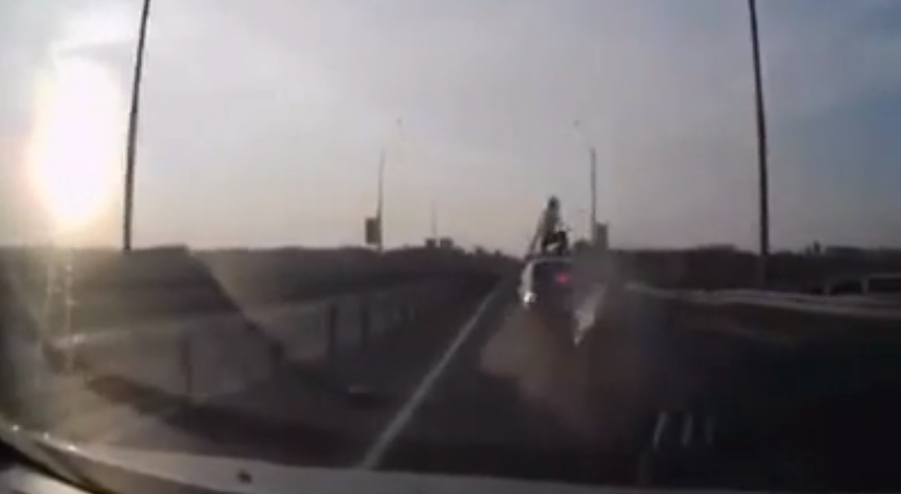It could just as well be a scene out of Mission Impossible or Spiderman, but this happened without safety gear or a trained stuntman, on a busy road in Russia, quite unexpectedly. It’s so astounding and unlikely that you will replay the video repetitiously, just to marvel at the rider’s acrobatic ability or sheer dumb luck, depending on how you view it.