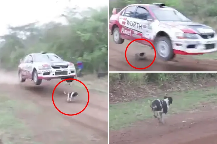 The footage shows the car missing the lucky canine’s head by inches, leaving the animal free to continue its journey down the very same road where even more rally cars were due to hurtle down in the very near future.